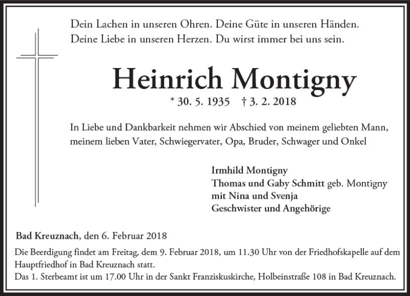 Hier finden Sie alle Traueranzeigen aus der Zeitung, die bisher für Heinrich Montigny erschienen sind. Weitere Traueranzeigen, die in der Zeitung erscheinen, werden hier ebenfalls aufgelistet