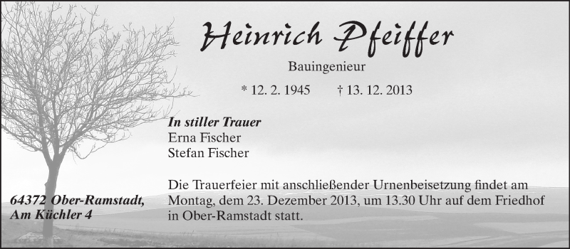 Hier finden Sie alle Traueranzeigen aus der Zeitung, die bisher für Heinrich Pfeiffer erschienen sind. Weitere Traueranzeigen, die in der Zeitung erscheinen, werden hier ebenfalls aufgelistet