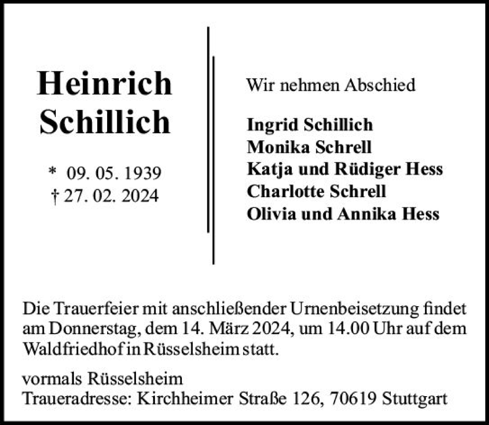 Hier finden Sie alle Traueranzeigen aus der Zeitung, die bisher für Heinrich Schillich erschienen sind. Weitere Traueranzeigen, die in der Zeitung erscheinen, werden hier ebenfalls aufgelistet
