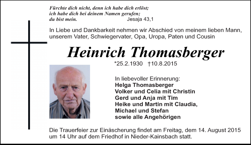 Hier finden Sie alle Traueranzeigen aus der Zeitung, die bisher für Heinrich Thomasberger erschienen sind. Weitere Traueranzeigen, die in der Zeitung erscheinen, werden hier ebenfalls aufgelistet