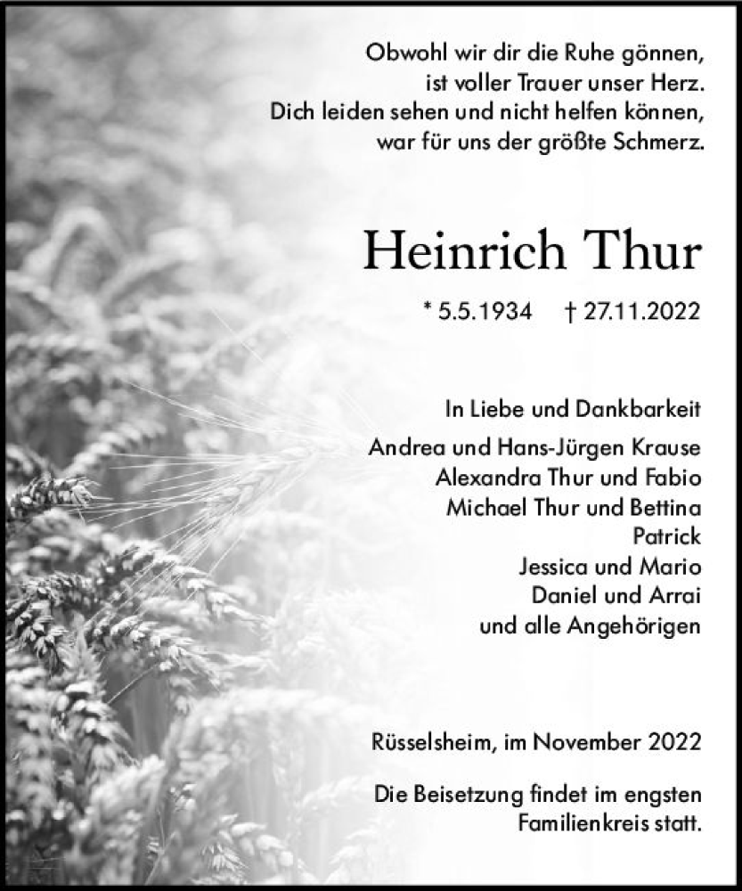 Hier finden Sie alle Traueranzeigen aus der Zeitung, die bisher für Heinrich Thur erschienen sind. Weitere Traueranzeigen, die in der Zeitung erscheinen, werden hier ebenfalls aufgelistet