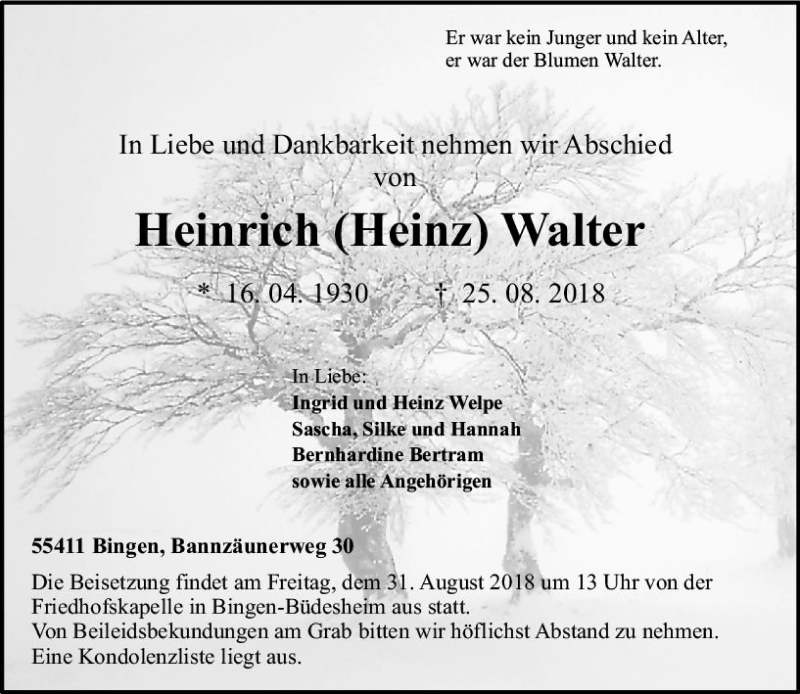 Hier finden Sie alle Traueranzeigen aus der Zeitung, die bisher für Heinrich Walter erschienen sind. Weitere Traueranzeigen, die in der Zeitung erscheinen, werden hier ebenfalls aufgelistet