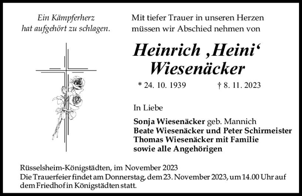 Hier finden Sie alle Traueranzeigen aus der Zeitung, die bisher für Heinrich Wiesenäcker erschienen sind. Weitere Traueranzeigen, die in der Zeitung erscheinen, werden hier ebenfalls aufgelistet