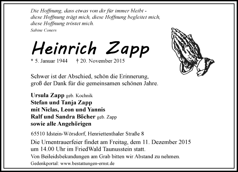 Hier finden Sie alle Traueranzeigen aus der Zeitung, die bisher für Heinrich Zapp erschienen sind. Weitere Traueranzeigen, die in der Zeitung erscheinen, werden hier ebenfalls aufgelistet