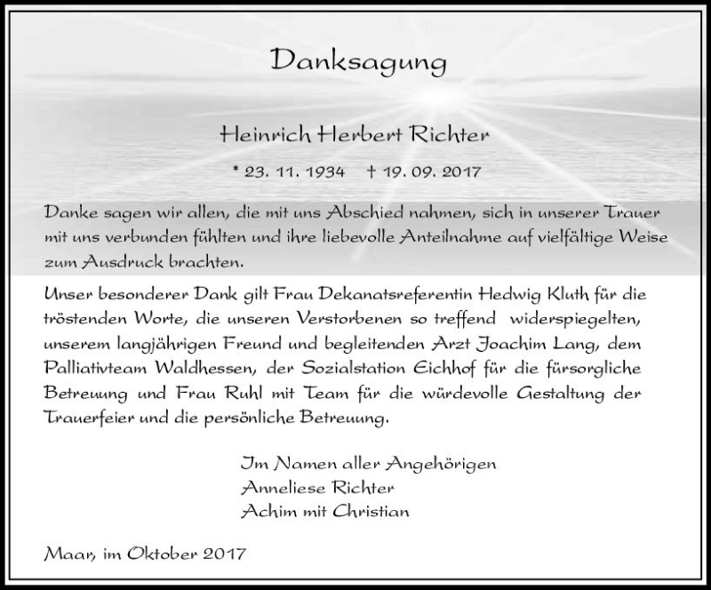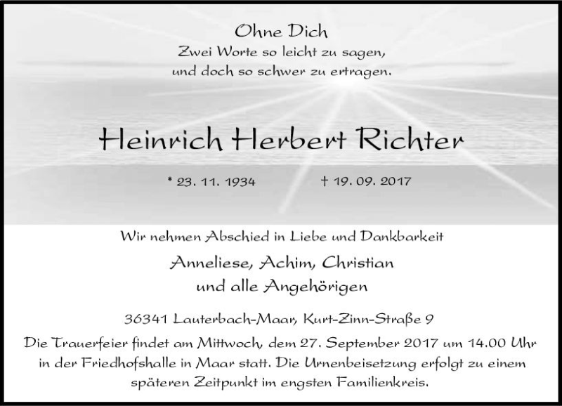 Hier finden Sie alle Traueranzeigen aus der Zeitung, die bisher für Heinrich Herbert Richter erschienen sind. Weitere Traueranzeigen, die in der Zeitung erscheinen, werden hier ebenfalls aufgelistet