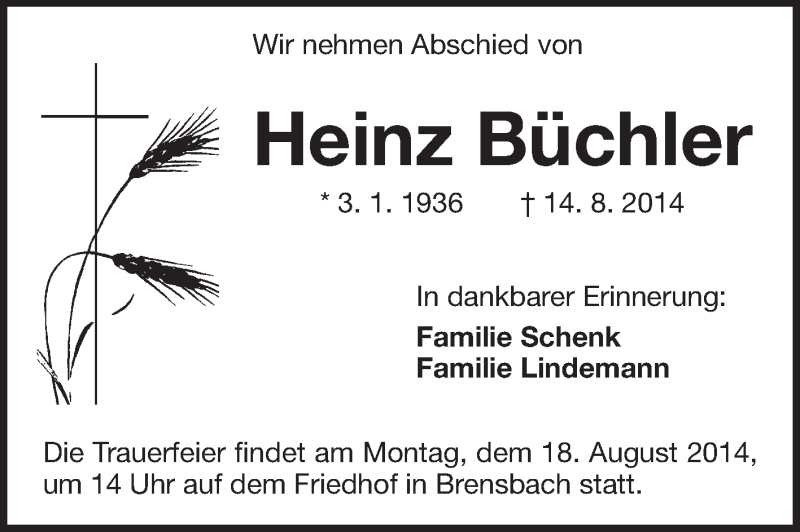 Hier finden Sie alle Traueranzeigen aus der Zeitung, die bisher für Heinz Büchler erschienen sind. Weitere Traueranzeigen, die in der Zeitung erscheinen, werden hier ebenfalls aufgelistet
