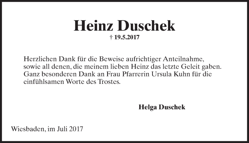 Hier finden Sie alle Traueranzeigen aus der Zeitung, die bisher für Heinz Duschek erschienen sind. Weitere Traueranzeigen, die in der Zeitung erscheinen, werden hier ebenfalls aufgelistet