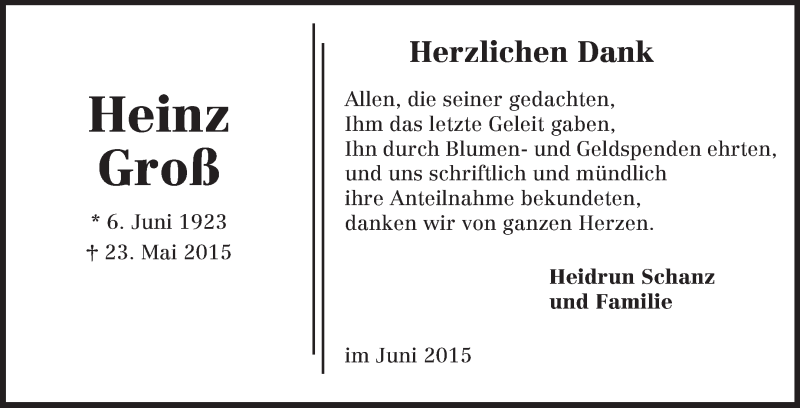 Hier finden Sie alle Traueranzeigen aus der Zeitung, die bisher für Heinz Groß erschienen sind. Weitere Traueranzeigen, die in der Zeitung erscheinen, werden hier ebenfalls aufgelistet