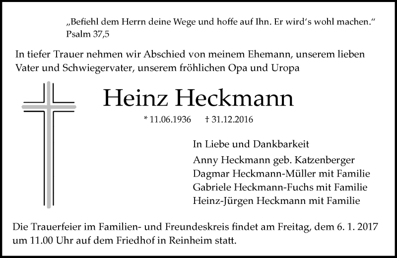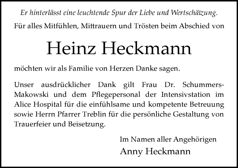 Hier finden Sie alle Traueranzeigen aus der Zeitung, die bisher für Heinz Heckmann erschienen sind. Weitere Traueranzeigen, die in der Zeitung erscheinen, werden hier ebenfalls aufgelistet
