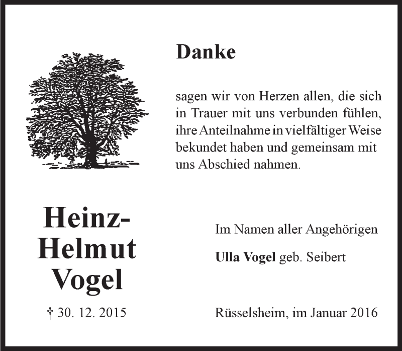 Hier finden Sie alle Traueranzeigen aus der Zeitung, die bisher für Heinz-Helmut Vogel erschienen sind. Weitere Traueranzeigen, die in der Zeitung erscheinen, werden hier ebenfalls aufgelistet