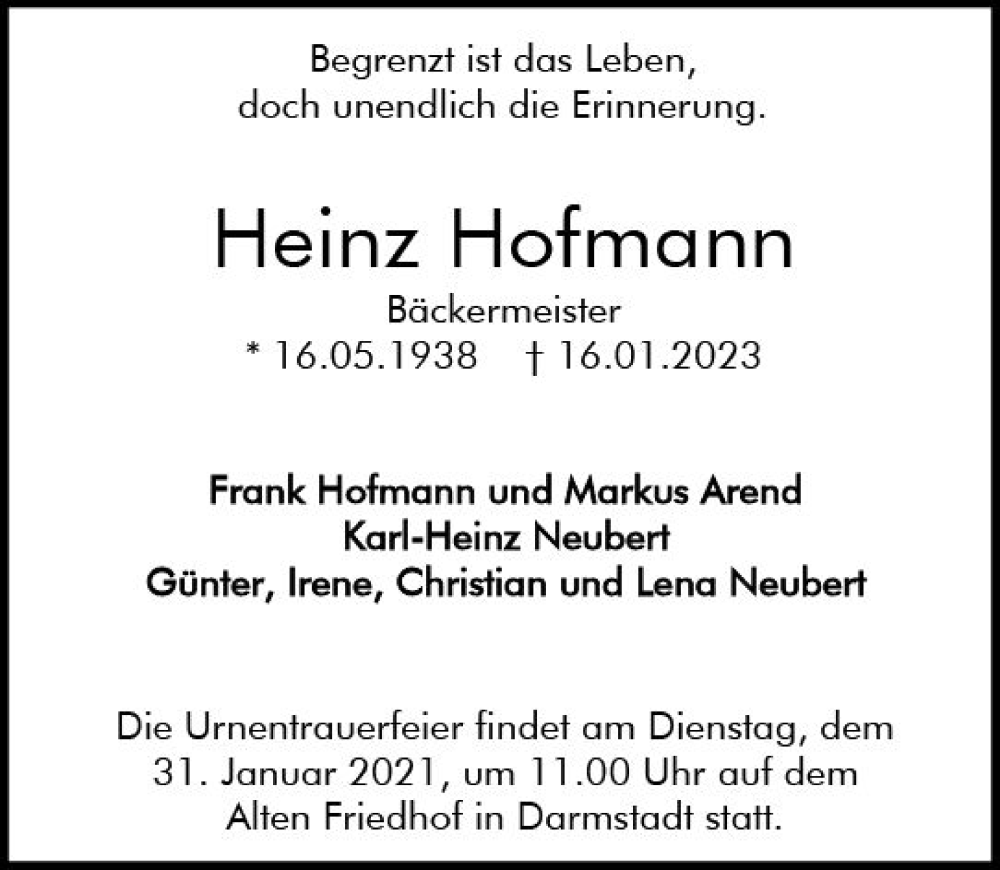 Hier finden Sie alle Traueranzeigen aus der Zeitung, die bisher für Heinz Hofmann erschienen sind. Weitere Traueranzeigen, die in der Zeitung erscheinen, werden hier ebenfalls aufgelistet
