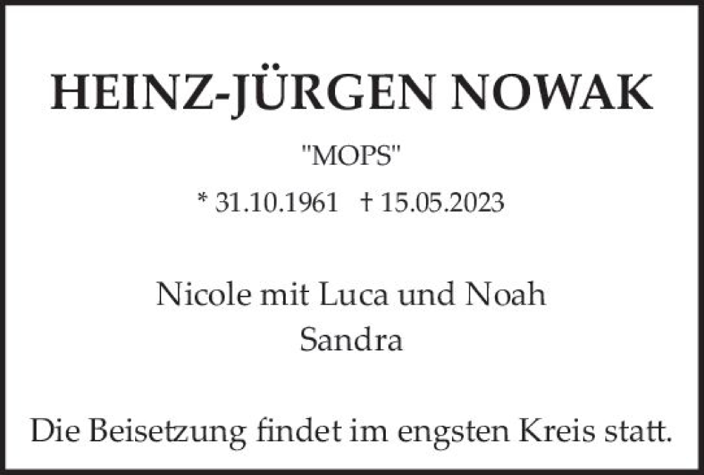 Hier finden Sie alle Traueranzeigen aus der Zeitung, die bisher für Heinz-Jürgen Nowak erschienen sind. Weitere Traueranzeigen, die in der Zeitung erscheinen, werden hier ebenfalls aufgelistet
