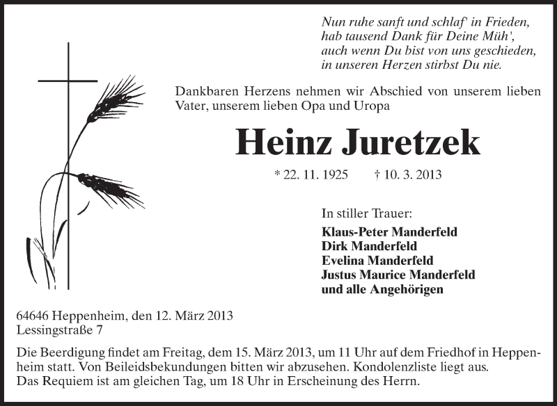 Hier finden Sie alle Traueranzeigen aus der Zeitung, die bisher für Heinz Juretzek erschienen sind. Weitere Traueranzeigen, die in der Zeitung erscheinen, werden hier ebenfalls aufgelistet