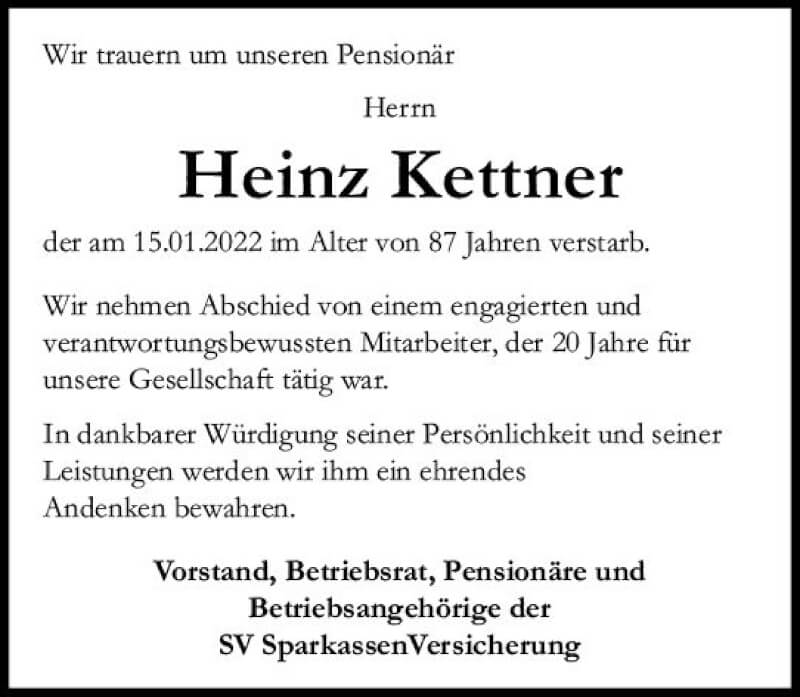 Hier finden Sie alle Traueranzeigen aus der Zeitung, die bisher für Heinz Kettner erschienen sind. Weitere Traueranzeigen, die in der Zeitung erscheinen, werden hier ebenfalls aufgelistet