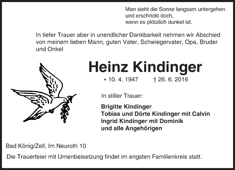 Hier finden Sie alle Traueranzeigen aus der Zeitung, die bisher für Heinz Kindinger erschienen sind. Weitere Traueranzeigen, die in der Zeitung erscheinen, werden hier ebenfalls aufgelistet