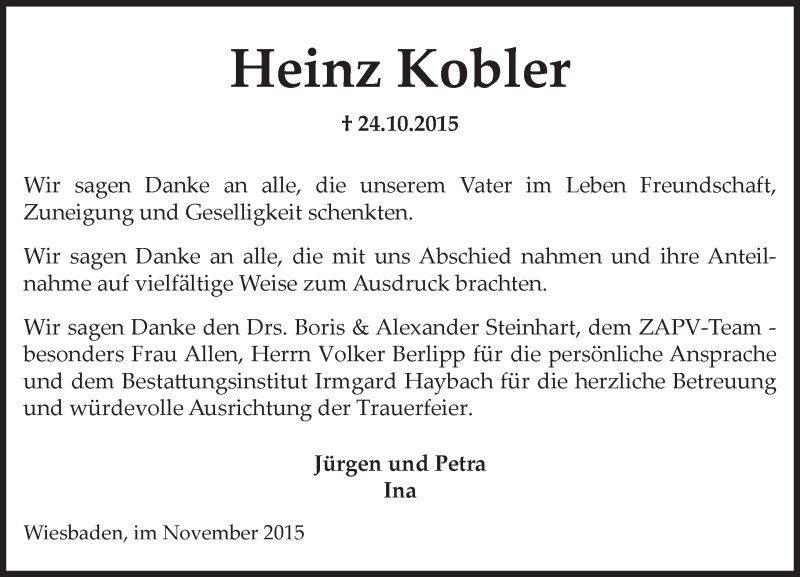 Hier finden Sie alle Traueranzeigen aus der Zeitung, die bisher für Heinz Kobler erschienen sind. Weitere Traueranzeigen, die in der Zeitung erscheinen, werden hier ebenfalls aufgelistet