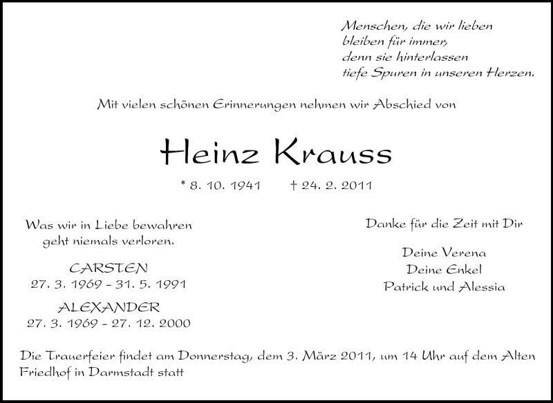 Hier finden Sie alle Traueranzeigen aus der Zeitung, die bisher für Heinz Krauss erschienen sind. Weitere Traueranzeigen, die in der Zeitung erscheinen, werden hier ebenfalls aufgelistet
