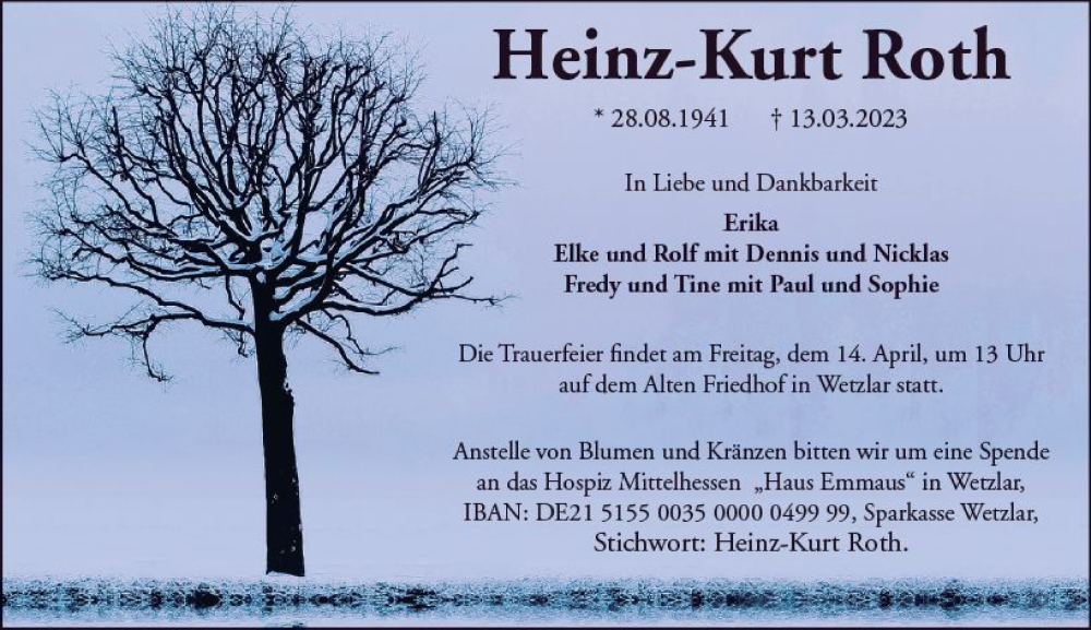 Hier finden Sie alle Traueranzeigen aus der Zeitung, die bisher für Heinz Kurt Roth erschienen sind. Weitere Traueranzeigen, die in der Zeitung erscheinen, werden hier ebenfalls aufgelistet
