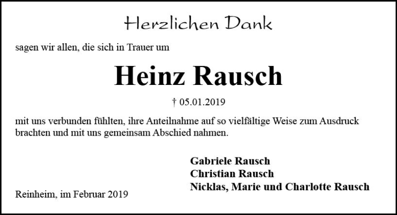 Hier finden Sie alle Traueranzeigen aus der Zeitung, die bisher für Heinz Rausch erschienen sind. Weitere Traueranzeigen, die in der Zeitung erscheinen, werden hier ebenfalls aufgelistet