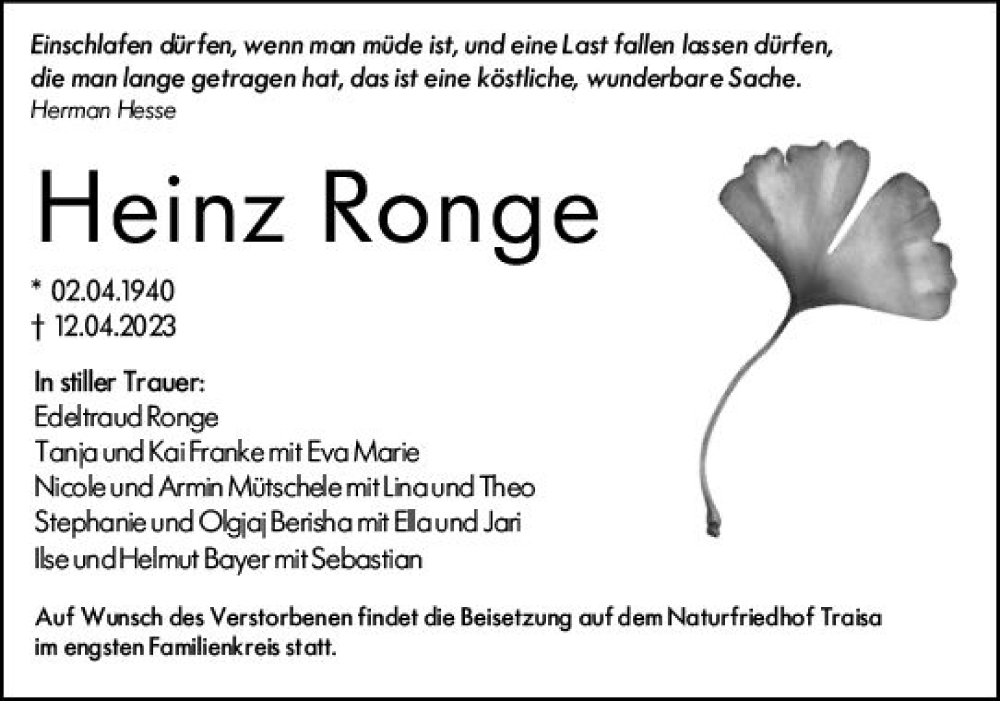 Hier finden Sie alle Traueranzeigen aus der Zeitung, die bisher für Heinz Ronge erschienen sind. Weitere Traueranzeigen, die in der Zeitung erscheinen, werden hier ebenfalls aufgelistet