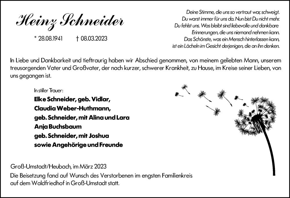 Hier finden Sie alle Traueranzeigen aus der Zeitung, die bisher für Heinz Schneider erschienen sind. Weitere Traueranzeigen, die in der Zeitung erscheinen, werden hier ebenfalls aufgelistet