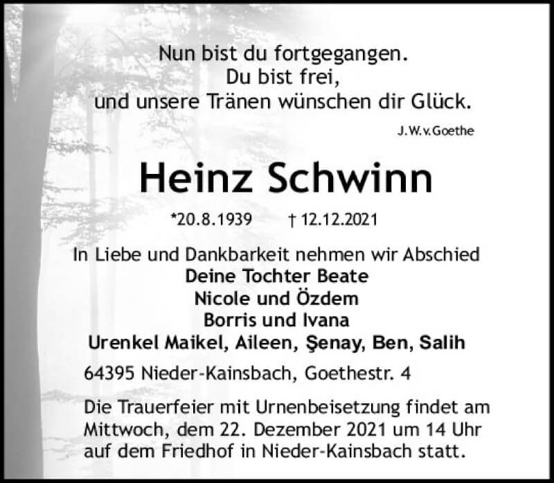 Hier finden Sie alle Traueranzeigen aus der Zeitung, die bisher für Heinz Schwinn erschienen sind. Weitere Traueranzeigen, die in der Zeitung erscheinen, werden hier ebenfalls aufgelistet