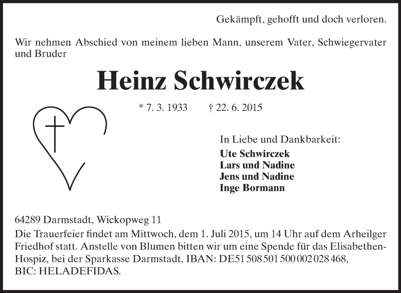 Hier finden Sie alle Traueranzeigen aus der Zeitung, die bisher für Heinz Schwirczek erschienen sind. Weitere Traueranzeigen, die in der Zeitung erscheinen, werden hier ebenfalls aufgelistet