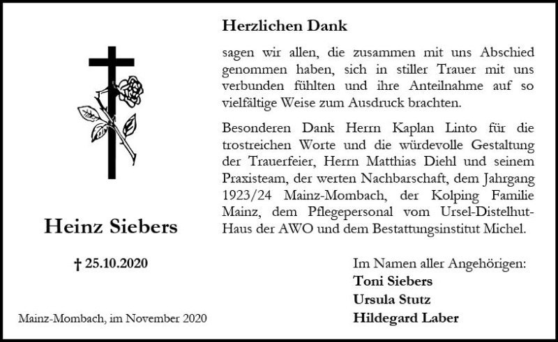 Hier finden Sie alle Traueranzeigen aus der Zeitung, die bisher für Heinz Siebers erschienen sind. Weitere Traueranzeigen, die in der Zeitung erscheinen, werden hier ebenfalls aufgelistet