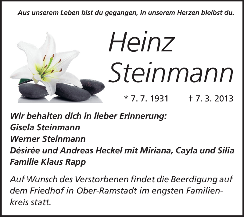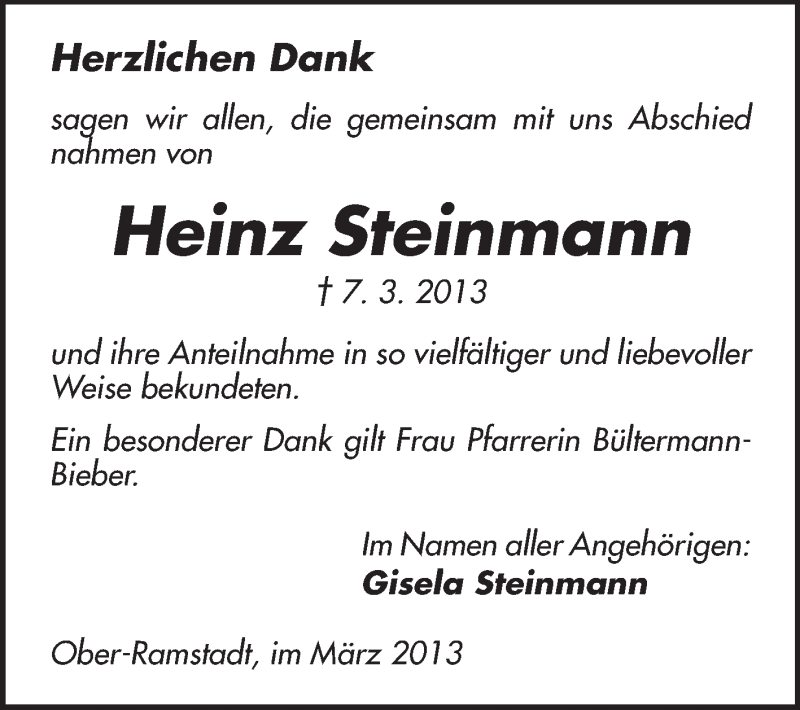 Hier finden Sie alle Traueranzeigen aus der Zeitung, die bisher für Heinz Steinmann erschienen sind. Weitere Traueranzeigen, die in der Zeitung erscheinen, werden hier ebenfalls aufgelistet