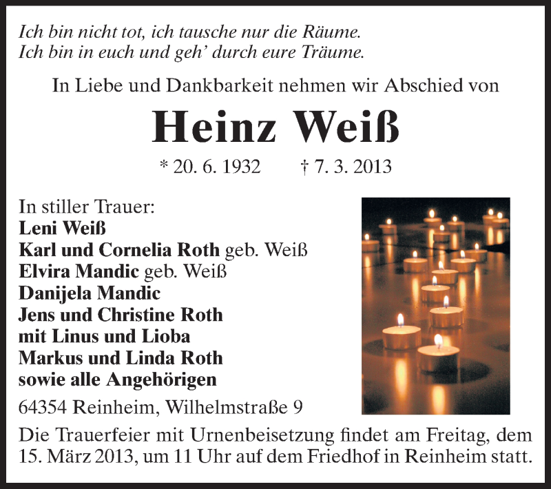 Hier finden Sie alle Traueranzeigen aus der Zeitung, die bisher für Heinz Weiß erschienen sind. Weitere Traueranzeigen, die in der Zeitung erscheinen, werden hier ebenfalls aufgelistet