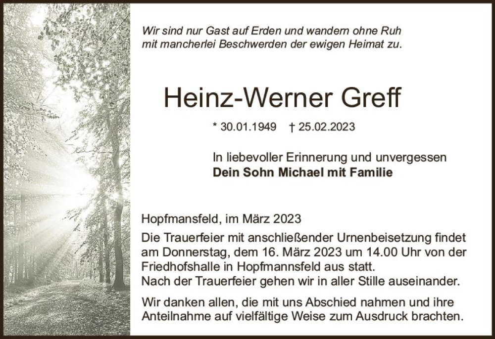 Hier finden Sie alle Traueranzeigen aus der Zeitung, die bisher für Heinz-Werner Greff erschienen sind. Weitere Traueranzeigen, die in der Zeitung erscheinen, werden hier ebenfalls aufgelistet