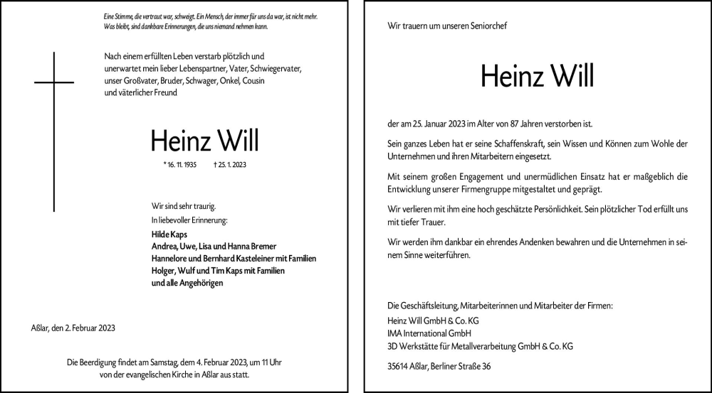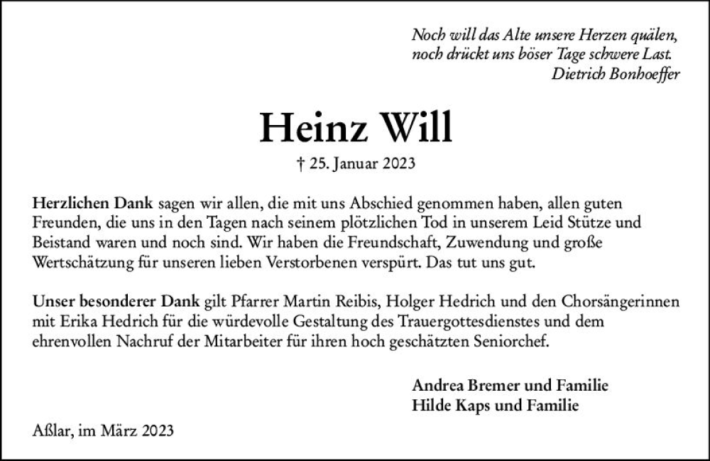 Hier finden Sie alle Traueranzeigen aus der Zeitung, die bisher für Heinz Will erschienen sind. Weitere Traueranzeigen, die in der Zeitung erscheinen, werden hier ebenfalls aufgelistet