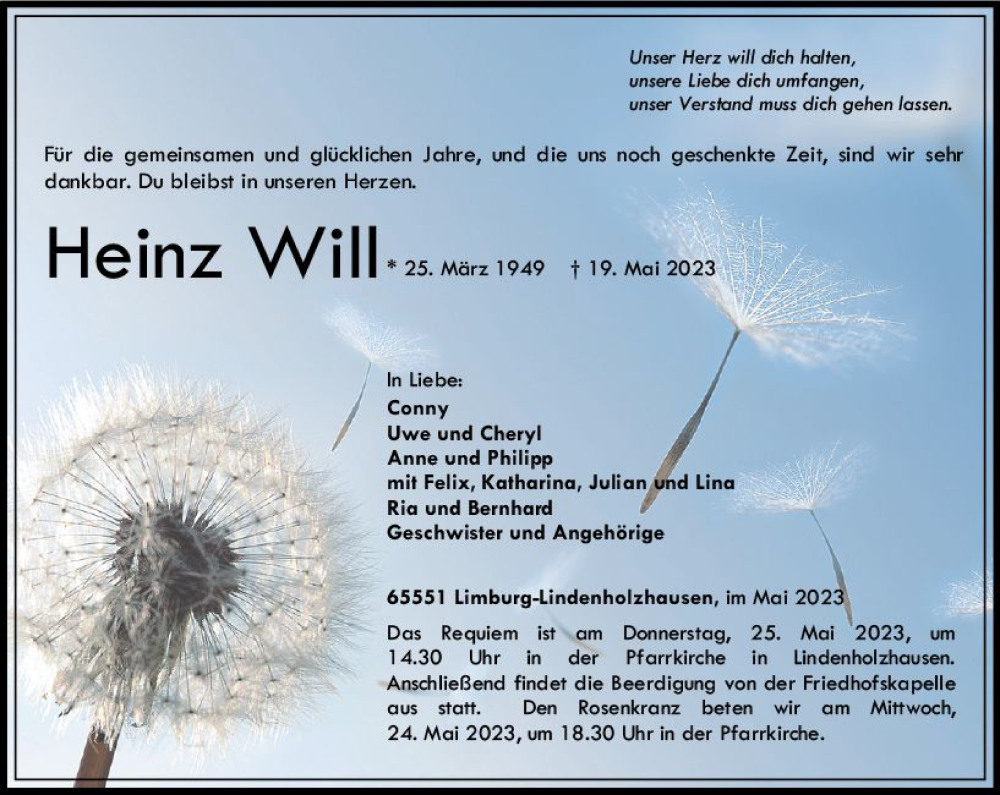 Hier finden Sie alle Traueranzeigen aus der Zeitung, die bisher für Heinz Will erschienen sind. Weitere Traueranzeigen, die in der Zeitung erscheinen, werden hier ebenfalls aufgelistet