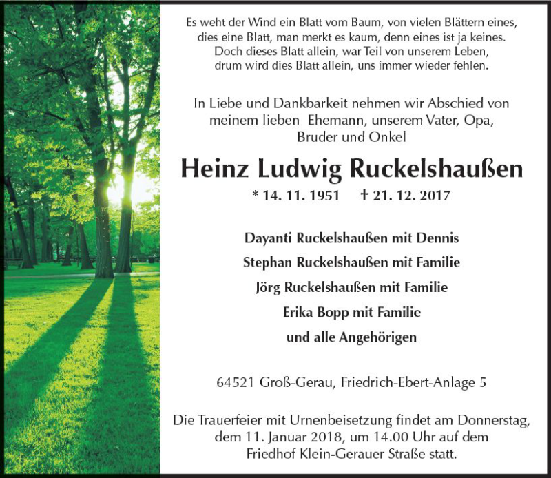 Hier finden Sie alle Traueranzeigen aus der Zeitung, die bisher für Heinz Ludwig Ruckelshaußen erschienen sind. Weitere Traueranzeigen, die in der Zeitung erscheinen, werden hier ebenfalls aufgelistet