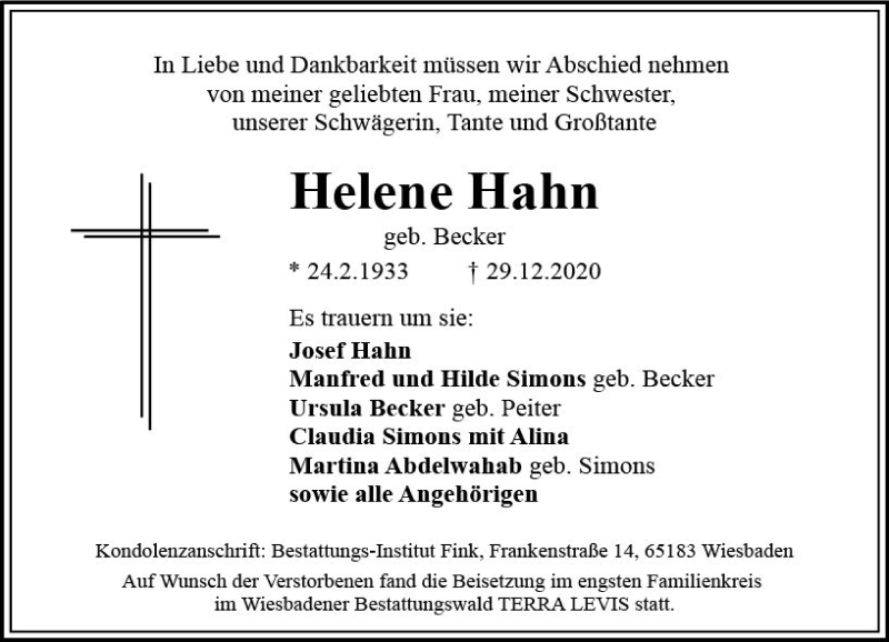 Hier finden Sie alle Traueranzeigen aus der Zeitung, die bisher für Helene Hahn erschienen sind. Weitere Traueranzeigen, die in der Zeitung erscheinen, werden hier ebenfalls aufgelistet