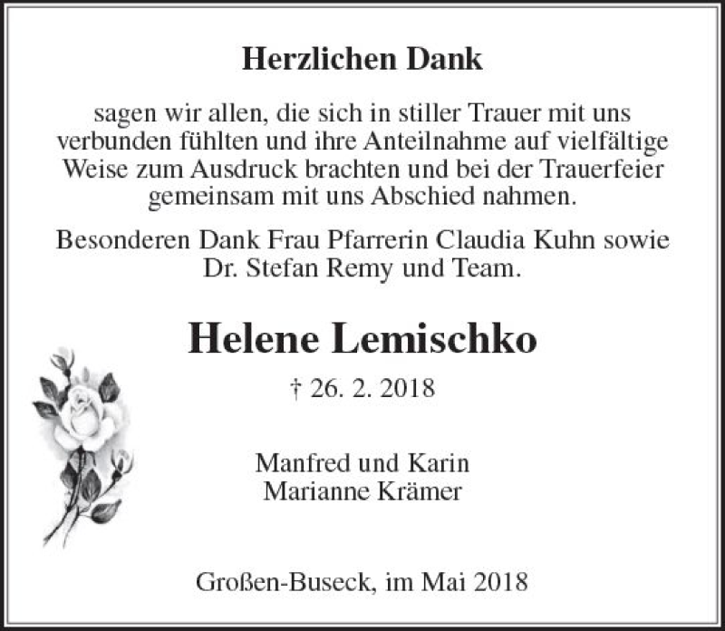 Hier finden Sie alle Traueranzeigen aus der Zeitung, die bisher für Helene Lemischko erschienen sind. Weitere Traueranzeigen, die in der Zeitung erscheinen, werden hier ebenfalls aufgelistet