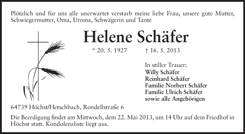 Hier finden Sie alle Traueranzeigen aus der Zeitung, die bisher für Helene Schäfer erschienen sind. Weitere Traueranzeigen, die in der Zeitung erscheinen, werden hier ebenfalls aufgelistet