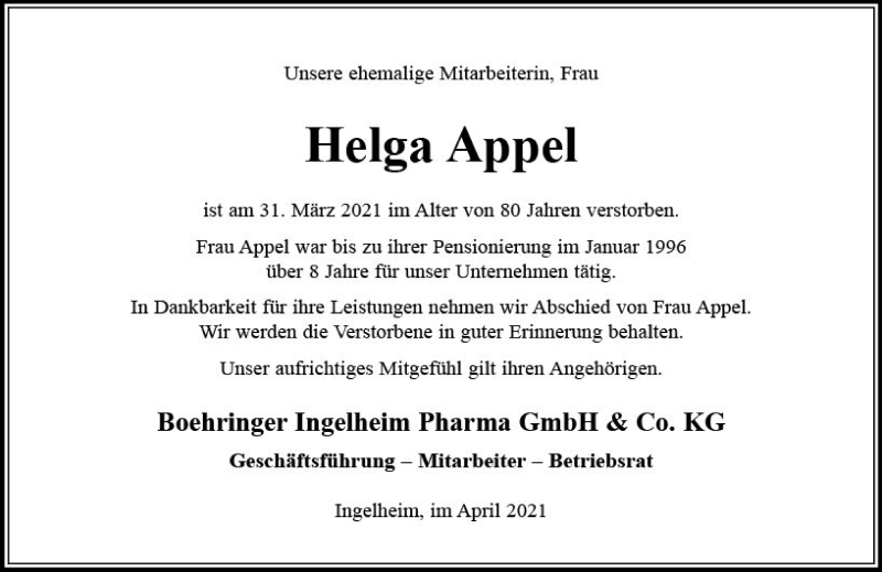 Hier finden Sie alle Traueranzeigen aus der Zeitung, die bisher für Helga Appel erschienen sind. Weitere Traueranzeigen, die in der Zeitung erscheinen, werden hier ebenfalls aufgelistet