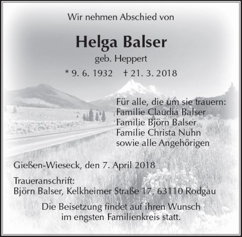 Hier finden Sie alle Traueranzeigen aus der Zeitung, die bisher für Helga Balser erschienen sind. Weitere Traueranzeigen, die in der Zeitung erscheinen, werden hier ebenfalls aufgelistet