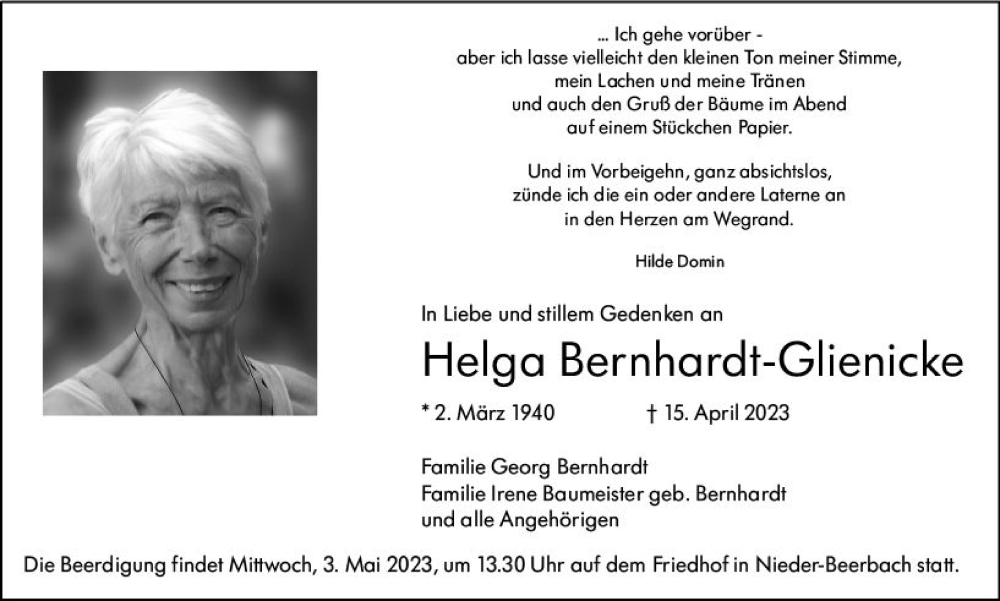 Hier finden Sie alle Traueranzeigen aus der Zeitung, die bisher für Helga Bernhardt-Glienicke erschienen sind. Weitere Traueranzeigen, die in der Zeitung erscheinen, werden hier ebenfalls aufgelistet