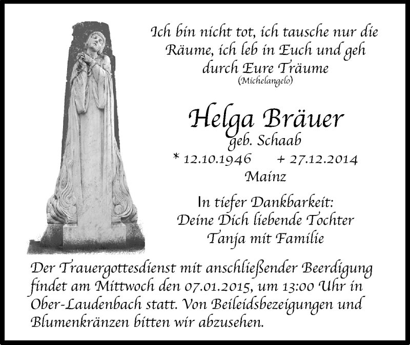 Hier finden Sie alle Traueranzeigen aus der Zeitung, die bisher für Helga Bräuer erschienen sind. Weitere Traueranzeigen, die in der Zeitung erscheinen, werden hier ebenfalls aufgelistet