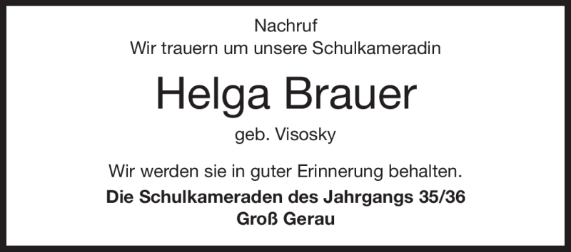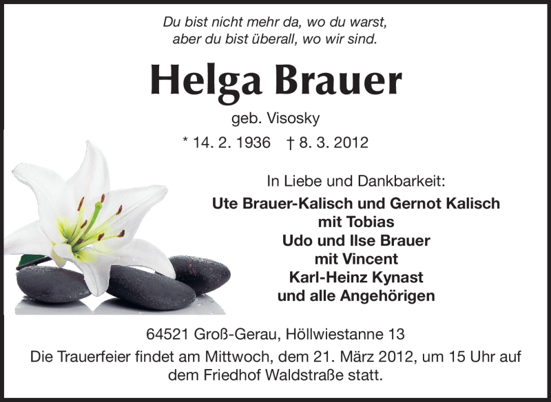 Hier finden Sie alle Traueranzeigen aus der Zeitung, die bisher für Helga Brauer erschienen sind. Weitere Traueranzeigen, die in der Zeitung erscheinen, werden hier ebenfalls aufgelistet