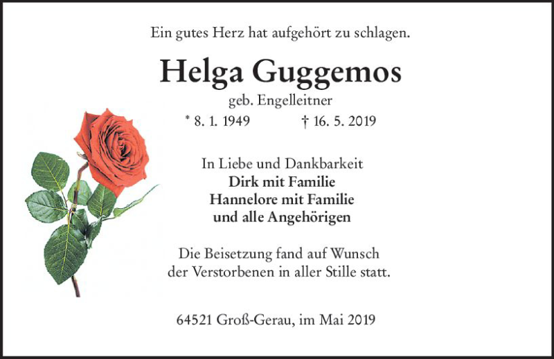 Hier finden Sie alle Traueranzeigen aus der Zeitung, die bisher für Helga Guggemos erschienen sind. Weitere Traueranzeigen, die in der Zeitung erscheinen, werden hier ebenfalls aufgelistet