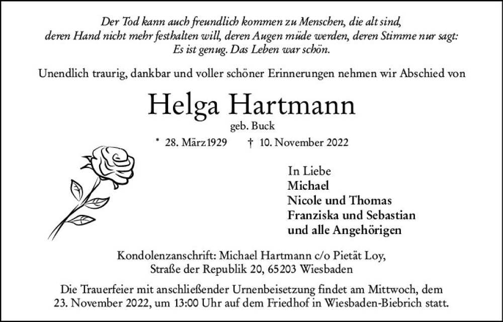 Hier finden Sie alle Traueranzeigen aus der Zeitung, die bisher für Helga Hartmann erschienen sind. Weitere Traueranzeigen, die in der Zeitung erscheinen, werden hier ebenfalls aufgelistet