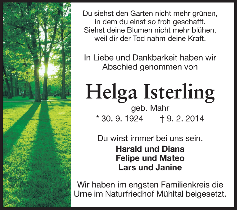 Hier finden Sie alle Traueranzeigen aus der Zeitung, die bisher für Helga Isterling erschienen sind. Weitere Traueranzeigen, die in der Zeitung erscheinen, werden hier ebenfalls aufgelistet
