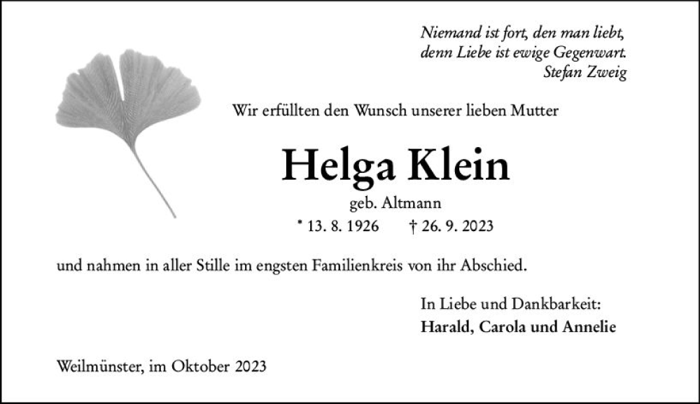 Hier finden Sie alle Traueranzeigen aus der Zeitung, die bisher für Helga Klein erschienen sind. Weitere Traueranzeigen, die in der Zeitung erscheinen, werden hier ebenfalls aufgelistet