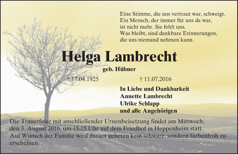 Hier finden Sie alle Traueranzeigen aus der Zeitung, die bisher für Helga Lambrecht erschienen sind. Weitere Traueranzeigen, die in der Zeitung erscheinen, werden hier ebenfalls aufgelistet