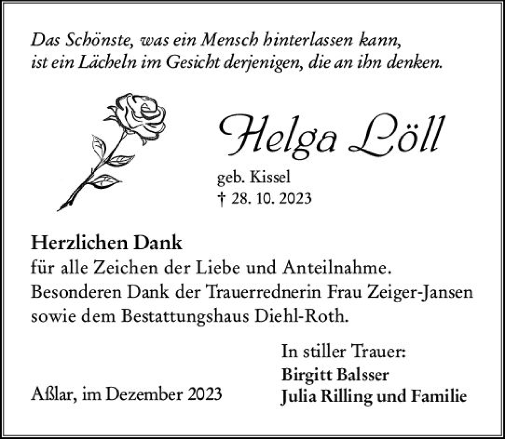 Hier finden Sie alle Traueranzeigen aus der Zeitung, die bisher für Helga Löll erschienen sind. Weitere Traueranzeigen, die in der Zeitung erscheinen, werden hier ebenfalls aufgelistet