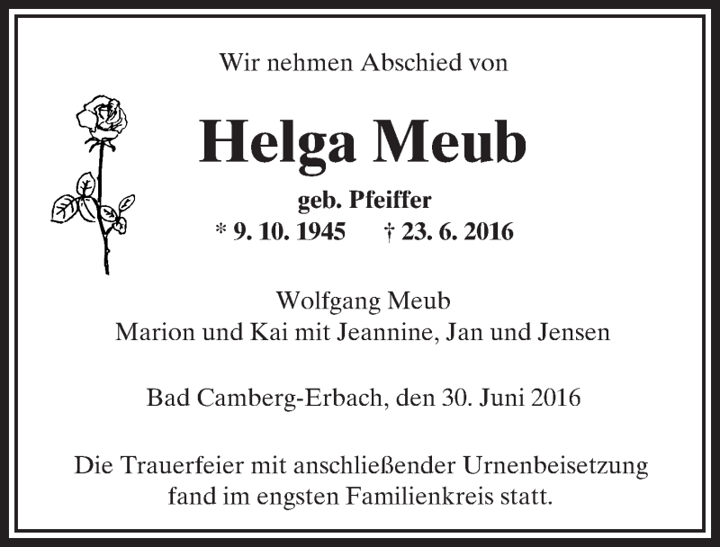 Hier finden Sie alle Traueranzeigen aus der Zeitung, die bisher für Helga Meub erschienen sind. Weitere Traueranzeigen, die in der Zeitung erscheinen, werden hier ebenfalls aufgelistet