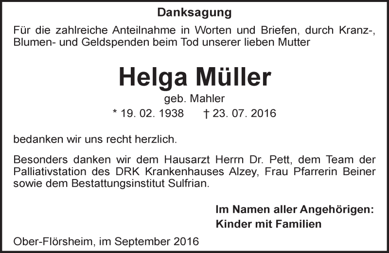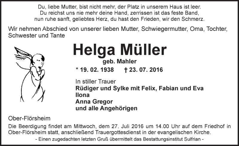 Hier finden Sie alle Traueranzeigen aus der Zeitung, die bisher für Helga Müller erschienen sind. Weitere Traueranzeigen, die in der Zeitung erscheinen, werden hier ebenfalls aufgelistet